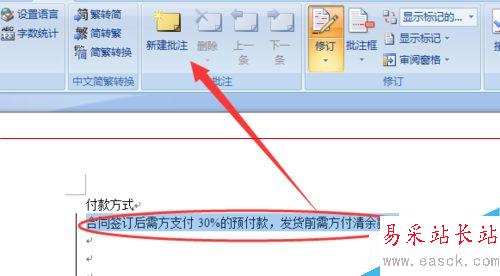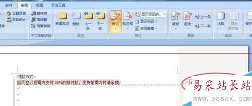 1、一般在合同中對付款方式爭議比較大,現(xiàn)在我們就以付款方式為例。打開word2007 功能區(qū)【審閱】
