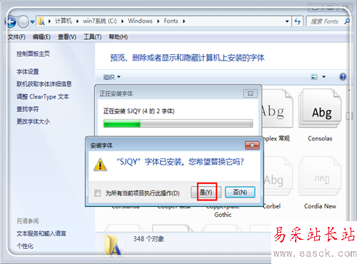 這時候就自動進行字體的安裝工作,如果提示有重復的,問是否替換,點擊“是”。