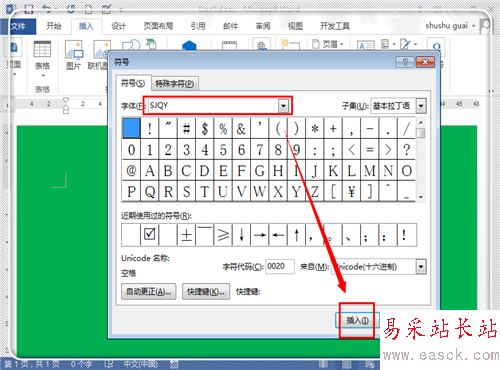 進入到符號插入欄目,在符號后面的方框書輸入“SJQY”,然后點擊“插入”。