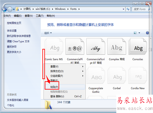 返回到剛才打開的windows字體庫,使用“ctrl+v”或者是右鍵點擊空白處,選擇“粘貼”,粘貼字體。