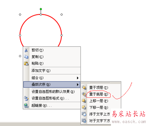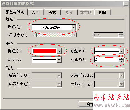 雙擊圖形設(shè)置為“無填充色”,線條寬度為2磅,顏色為紅色,“疊放次序”為“最底層”。