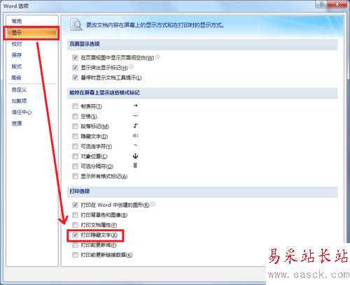 2.2、進入【word 選項】,選擇【顯示】,在【打印選項】中,找到【打印隱藏文字】,并前面的方框內打勾即可。