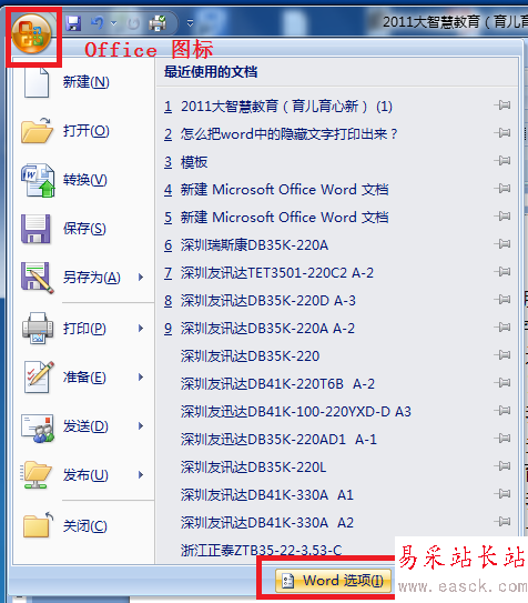 2.1、同樣的需要先打開文檔,找到文檔左上角【office 圖標】,點擊圖標,找到【word 選項】;