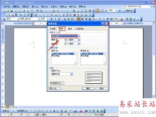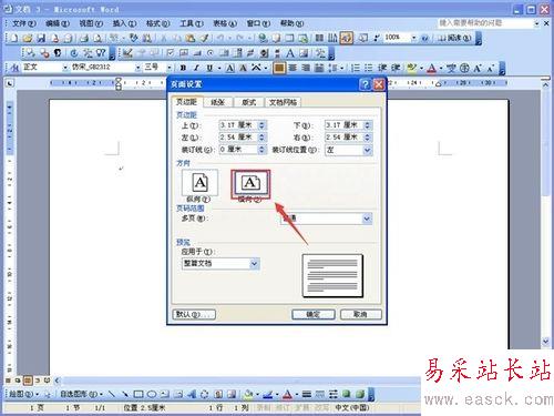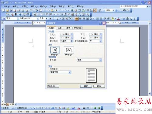 依次在對話框“頁邊距”、“紙張”、“文檔網(wǎng)格”頁面,設(shè)置頁面排版為橫向,左邊距為4CM,上、下、右邊距可自行調(diào)整,紙張為B4,文檔網(wǎng)格為水平方向,欄數(shù)為2.
