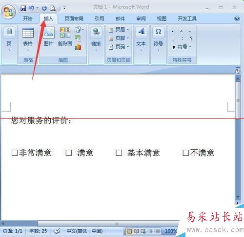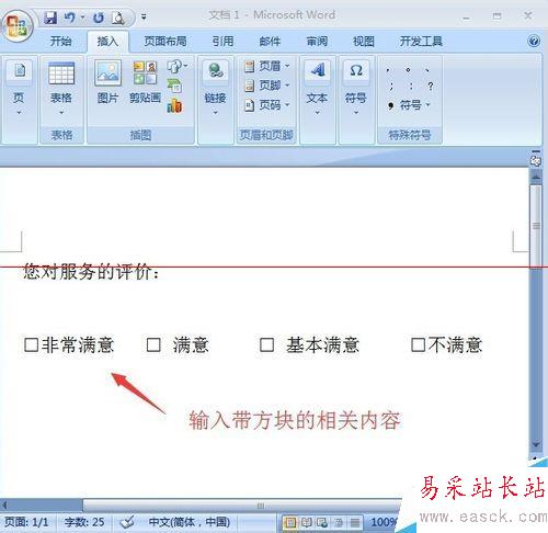 2、輸入跟方框選擇有關的內容,比如,我們輸入服務滿意度調查,分成幾個檔,每一檔前面都有一個小方框,如圖所示。