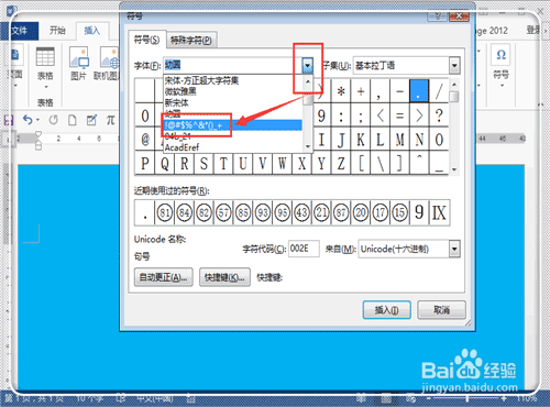 4、在“字體”后面,下拉倒三角形,找到這個亂碼的名字,點擊他。