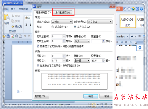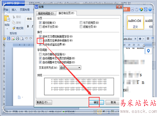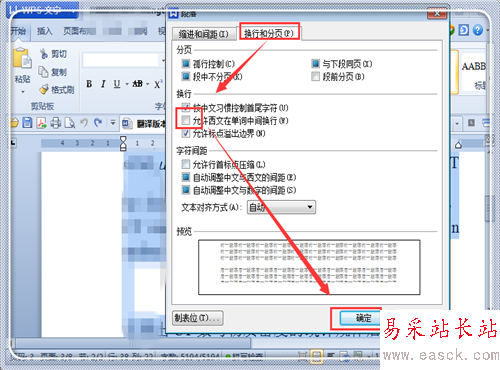3、點擊“換行和分頁”,去掉“允許西文在單詞中間換行”前面的√。點擊“確定”。