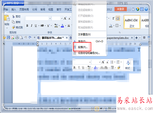 2、點擊鼠標右鍵。點擊“段落”。