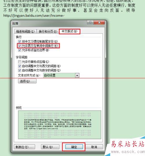 4、在彈出的“段落”對話框中,選擇“中文版式(H)”選項卡,在該選項卡的“換行”欄中,在“允許西文在單詞中間換行(W)”復選框前打勾。其他默認狀態即可,如圖4所示。
