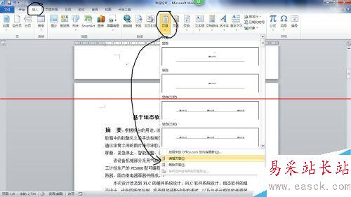 6、將鼠標光標分別點擊第二頁(中文摘要頁)、第三頁(英文摘要頁)頁眉,點擊“頁眉和頁腳”組上的“頁眉”中的“空白三欄”,使其在第二頁(中文摘要頁)、第三頁(英文摘要頁)中出現三個”鍵入文字“的頁面,在兩端輸入論文的頁眉要求,并刪除中間的”鍵入文字“。在第四頁(正文頁)頁眉,點擊“頁眉和頁腳”組上的“頁眉”中的“空白”,輸入論文要求的頁眉。然后點擊右上角的”關閉頁眉和頁腳“,畢業論文的頁眉設置問題完畢。