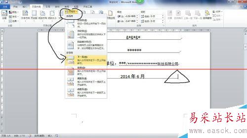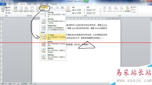 1、打開畢業論文,將鼠標光標點擊在首頁的最后一個字,然后點擊“頁面布局”,再點擊頁面設置組中的“分隔符”找到分節符中的“下一頁”。