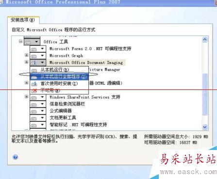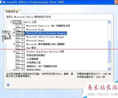 4、雙擊展開,選擇“Microsoft Document Imaging”,注意將鼠標放在下圖圓圈所示位置點擊更改屬性標志。下圖的標志是第一次調用時安裝,但是我們一般情況下根本不知道如何調用,所以也就不可能提示你安裝,所以我們要修改。