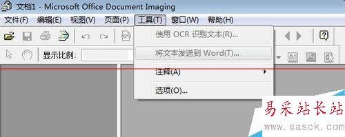 7、進入Microsoft Office Document Image,打開一個圖片(包含文字的,多點比較好),在工具里有個OCR識別工具,點擊運行它,選擇“工具”菜單里的“使用OCR識別文本”就可以了,識別完成后圖片中的文字就能直接復制了。