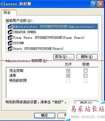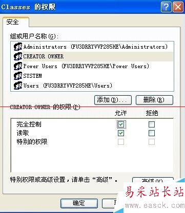 4、選中“CREATOR OWNER”項,勾選“完全控制”,最后點擊“應用”按鈕。