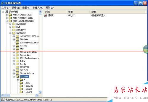 2、順次打開擴展項,找到“HKEY_LOCAL_MACHINE/SOFTWARE/Classes”位置。
