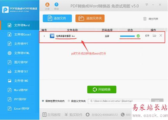 ❹點擊軟件下方的“開始轉換”按鈕,軟件開始對添加的pdf文件進行轉換,片刻之后文件就轉換完成了,此時pdf文件變成了word文件。