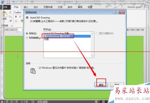 3、點擊“圖元windows圖元文件”,選中它,然后點擊“確定”按鈕,這時候在cad中繪制的圖形就以圖元的格式成功粘貼到word中。