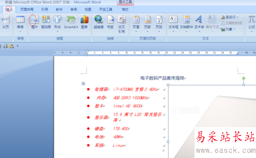 4、設(shè)置好文本后,我們準(zhǔn)備插入圖片。單擊“插入”插圖里面“圖片”彈出對(duì)話框后,選擇我們準(zhǔn)備的好的圖片。這會(huì)可能引文圖片大小等原因會(huì)影響到文本格式,我們稍后再調(diào)整。同樣我們?cè)诓迦肫渌a(chǎn)品的圖片,以此類推