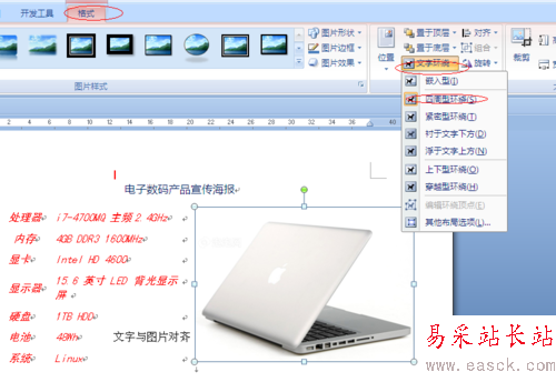 6、這一步我們?cè)O(shè)置文字與圖片的關(guān)系。選中第一幅圖,單擊“格式”選擇排列里面的“文字環(huán)繞”,從彈出的下拉菜單中選擇“四周環(huán)繞”,按照同樣方法設(shè)置其他圖片。設(shè)置好,我們把圖片拖動(dòng)到合適的位置,圖片與左側(cè)文字對(duì)齊。