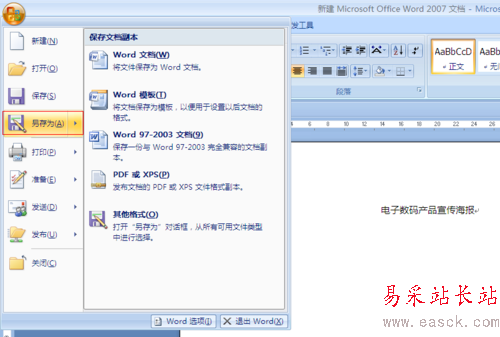 1、輸入海報(bào)的內(nèi)容。今天制作一個(gè)電子產(chǎn)品的宣傳海報(bào)。新建一個(gè)空白文檔,輸入“電子數(shù)碼產(chǎn)品宣傳海報(bào)”,單擊開(kāi)始--段落-居中,我們首先設(shè)置好標(biāo)題,并保存好。單擊office按鈕,選擇“另存為”單擊想要保存的格式和位置