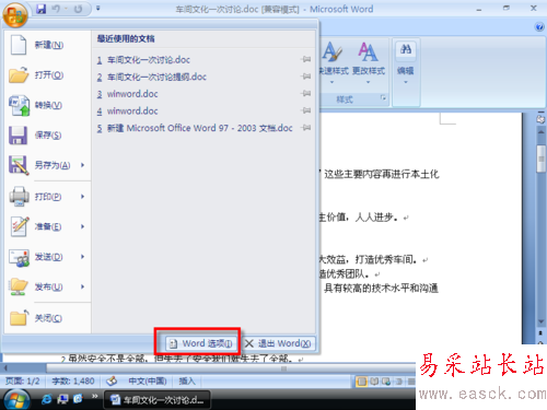 2、打開word2007左上角的圓形圖標,選擇“word選項”。