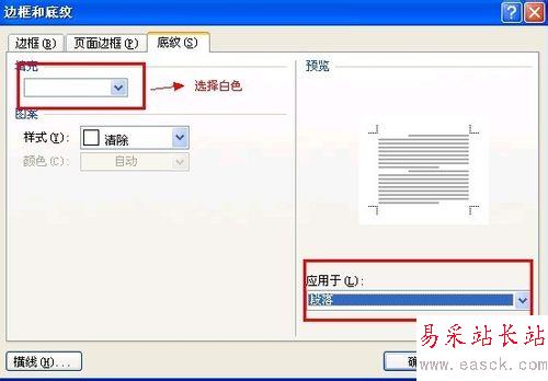 然后找到“填充”和“應用于”,填充部分選擇白色,應用于選擇段落,選擇完以后點“確定”如下圖所示