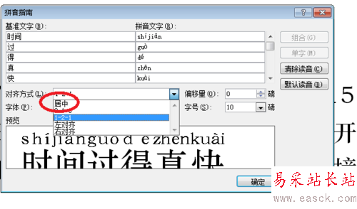 7、在彈出的對話框中,我們只需修改一下拼音的居中方式就可以了,其他的用默認值就行了。