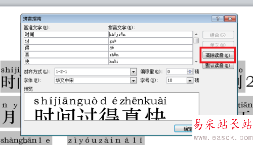 8、這樣,我們的就可以輕松地實現漢字加注拼音了。如何不想拼音了怎么辦呢?只在拼音指南設置中,點擊“清除讀音”,確定即可消除注音。