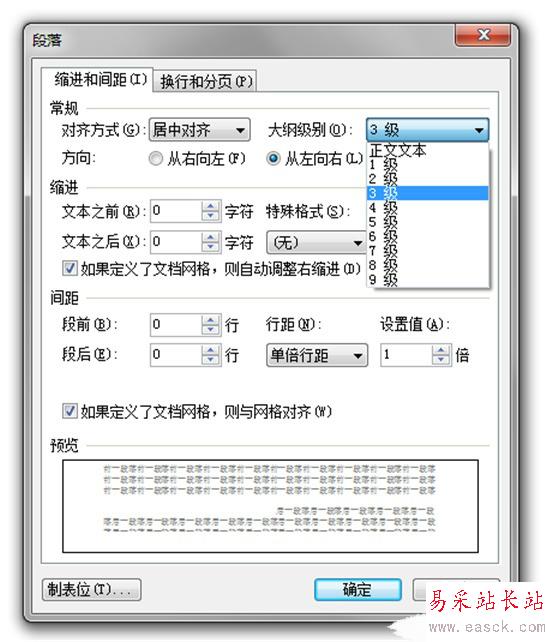 標題居中、段落左右對齊等也不用很麻煩地每次都去人為地設置,也有更省事辦法:仍然到“段落”設置窗口,依次在“常規”一組的“大綱級別”下拉列表框中選擇“正文”“1級”“2級”……“9級”,然后分別設置左側的“對齊方式”,對于正文我們選擇“左對齊”或“兩端對齊”,而對于1到9級標題,通常版式是選擇“居中對齊”。這樣設置之后,當你輸入各級標題或正文并應用了這種樣式后,各自的對齊便自動完成,不需要人為去設置或調整。
