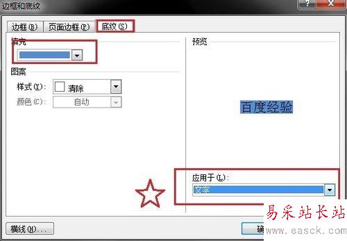 3、在彈出來(lái)的邊框和底紋對(duì)話框,選中底紋,修改想要的顏色,最后一定要將應(yīng)用于由“段落”改為“文字”,最后確定即可