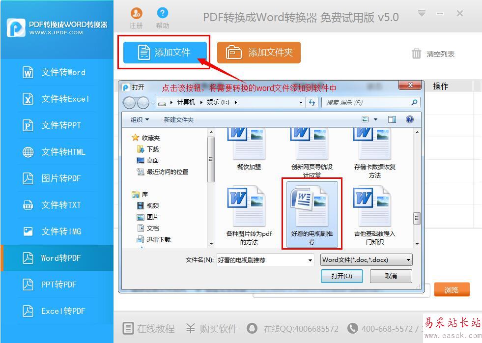 第3步,點擊“添加文件”按鈕,將需要轉換的word文件添加到軟件中。大家也可以使用鼠標將word文件拖拽到軟件界面中進行文件添加。