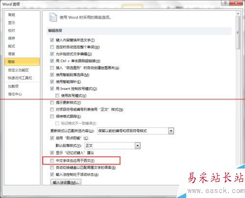 4、在高級(jí)設(shè)置頁(yè)面右側(cè),編輯選項(xiàng)欄目下方,可以找到中文字體也應(yīng)用于西文,系統(tǒng)默認(rèn)是處于勾選狀態(tài),也就是說(shuō),設(shè)置中文字體,英文字體也會(huì)隨著改變,我們把前面的勾去掉,然后點(diǎn)擊確定