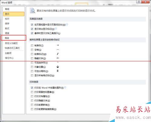 3、在打開(kāi)的Word選項(xiàng)頁(yè)面中,左側(cè)菜單欄找到高級(jí)按鈕,點(diǎn)擊打開(kāi)