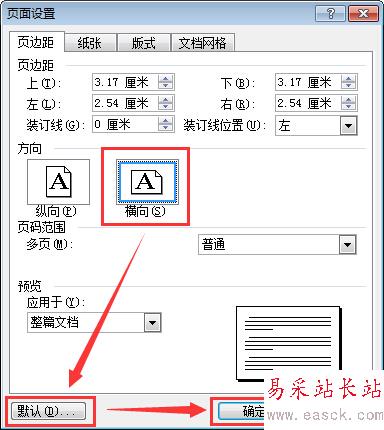 2.將縱向改成橫向,另外最下面默認(rèn)也要點一下,不然你這次改完后下次再打開word文檔又得重新設(shè)置。最后確定即可。