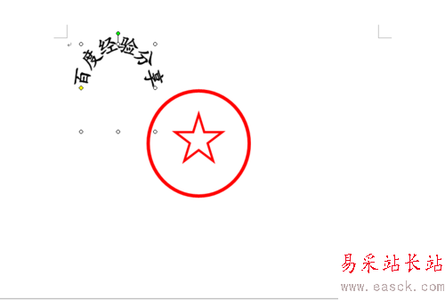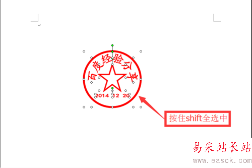 按住shift按鈕,全部選中四個(gè)圖形圓,弧形藝術(shù)字,五角星,和直線藝術(shù)字,如圖所示