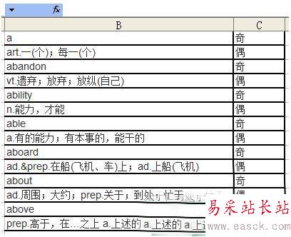 2、將表格復制到Excel,在空白列填充“奇偶”文字。在第一二行空白列分別填上奇偶,選中這兩個單元格,光標移到第二個單元格右下角時變為+,按住鼠標左鍵往下拖動,完成填充。