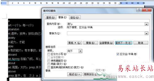 2、Ctrl+H調出替換對話框查找內容輸入:([A-z])^13替換為輸入:/1^t高級或更多選擇“使用通配符”,點擊全部替換。