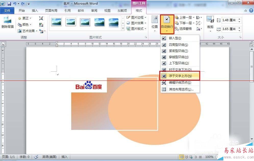 5、將矩形形狀復(fù)制一個覆蓋到插入的橢圓型按鈕上方(即橢圓形狀上方、下方各有一個矩形形狀);調(diào)整橢圓“形狀輪廓”為無輪廓,“形狀填充”為“橙色,強(qiáng)調(diào)文字顏色6,深色25%”;選中企業(yè)標(biāo)志圖片,點(diǎn)擊“格式”選項卡下的“自動換行”按鈕,選擇“浮于文字上方”,并調(diào)節(jié)企業(yè)標(biāo)志圖片的大小和位置