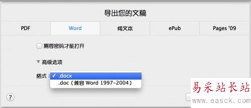 3、在“導出您的文稿”下拉菜單“Word”選項里,按一下高級選項旁的三角形。