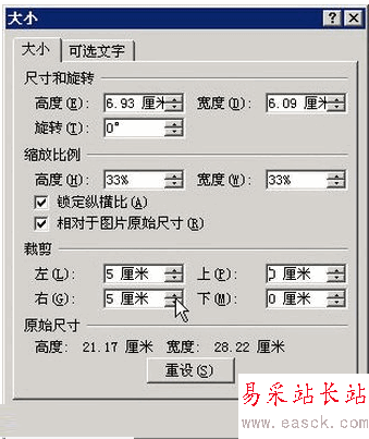第2步,在打開的“大小”對話框中,切換到“大小”選項卡。在“裁剪”區域分別設置左、右、上、下的裁剪尺寸,并單擊“確定”按鈕,如圖2所示。