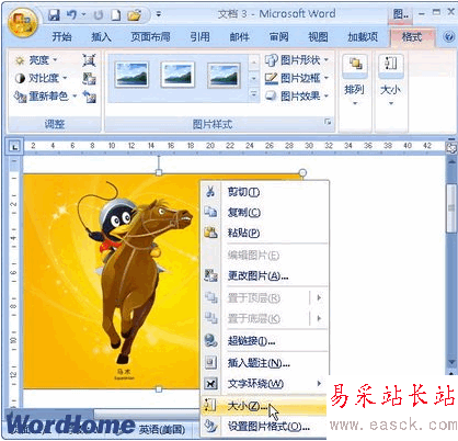 第1步,打開Word2007文檔窗口,右鍵單擊需要裁剪的圖片,在打開的快捷菜單中選擇“大小”命令,如圖1所示。