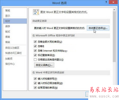 第2步,在打開的“Word選項”對話框中切換到“校對”選項卡,然后在“自動更正選項”區域單擊“自動更正選項”按鈕,如圖2所示。