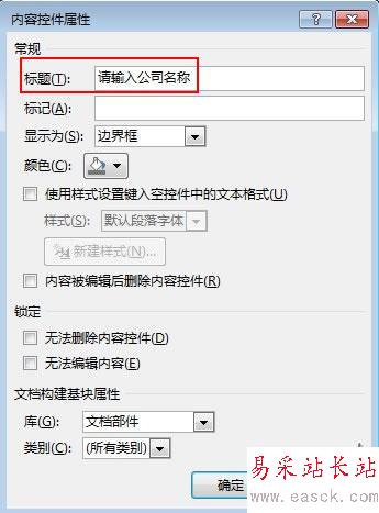 ③彈出一個內容控件屬性對話框,在常規(guī)--標題中輸入文字信息:請輸入公司名稱。