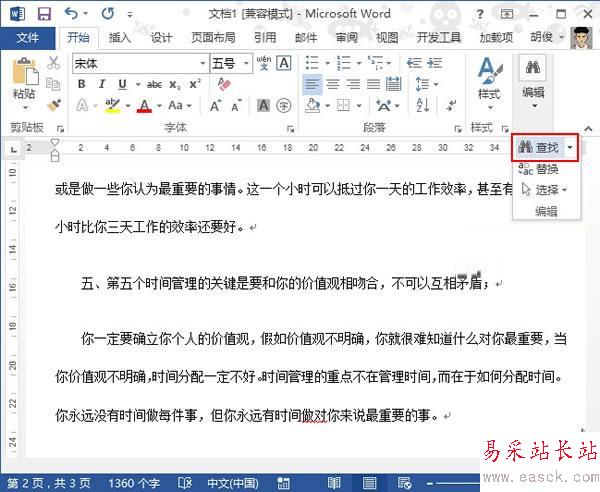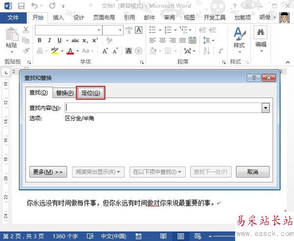 ③插入書簽的目的是為了下次打開文檔繼續瀏覽的時候記得位置,那么該怎么定位到書簽呢?插入書簽之后,步驟2的圖定位按鈕會激活,點擊即可快速定位,這里,小編再給大家介紹另外一種方法。點擊菜單欄--開始--編輯--查找。