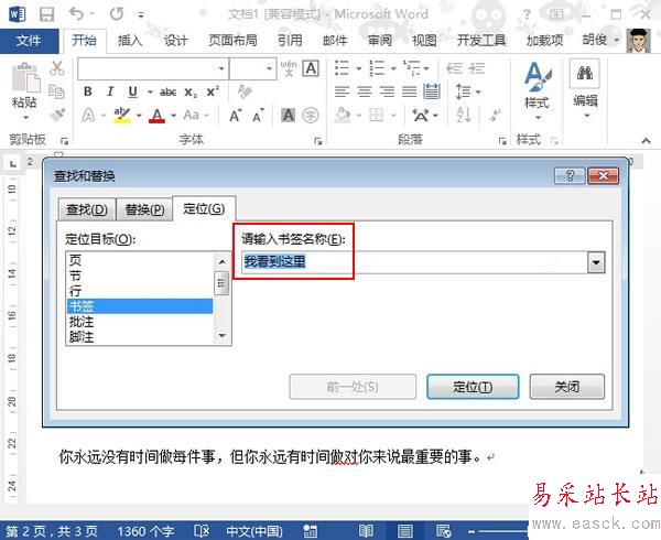 ⑥單擊定位按鈕即可快速定位到之前插入書簽的位置了。