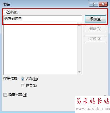 ②彈出書簽對話框,輸入書簽名稱,添加。這樣,我們就插入了一個書簽。