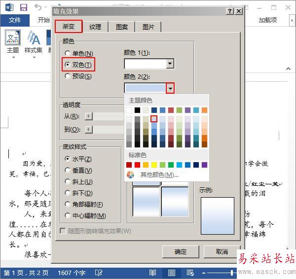 2、此時會彈出一個“填充效果”對話框,我們切換到“漸變”選項卡,在“顏色”區域中單擊“雙色”單選按鈕,并在其右側選擇我們喜歡的顏色搭配。例如,我們現在切換到“漸變”選項卡,單擊“顏色2”下拉框右側的下拉按鈕,在“主題顏色”中選擇“深藍,文字2,淡色80%”。