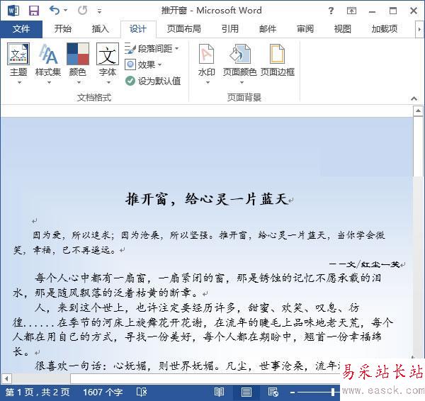 你想讓你的文檔每天看起來都有那么點兒不一樣,隨你的心情變化嗎?我可以偷偷告訴你個方法哦,設置你文檔的頁面背景吧。說實話,這個方法不僅簡單而且很實用的。不信的話我們就一起來看看如何在word2013中為文檔設置頁面背景吧。