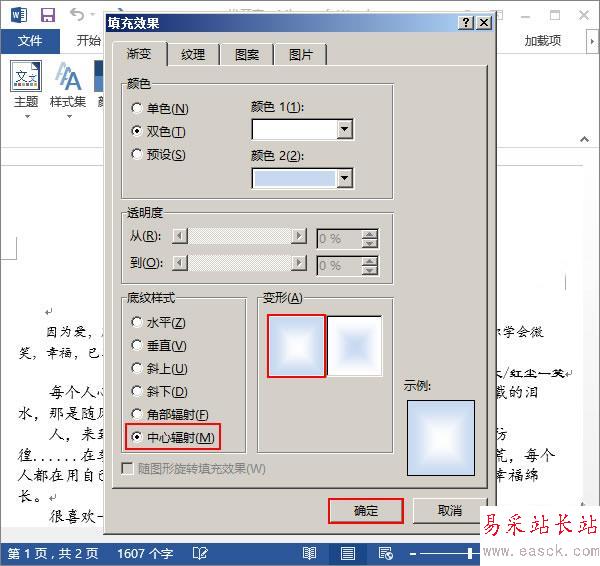 3、現在,我們可以在“底紋樣式”和“變形”中選擇我們喜歡的樣式形狀了,最后單擊“確定”按鈕即可。例如,我們現在選擇“中心輻射”以及第一種形變,然后單擊“確定”按鈕。