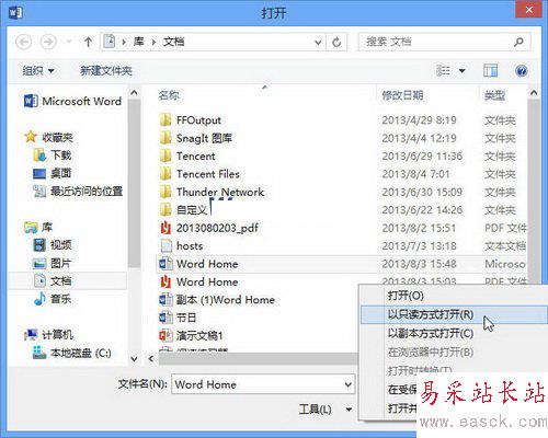 第2步,在打開的“打開”對話框中,選中需要打開的Word文檔,然后單擊“打開”按鈕右側的下拉三角按鈕。在打開的菜單中選擇“以只讀方式打開”選項即可,如圖2013080402所示。
